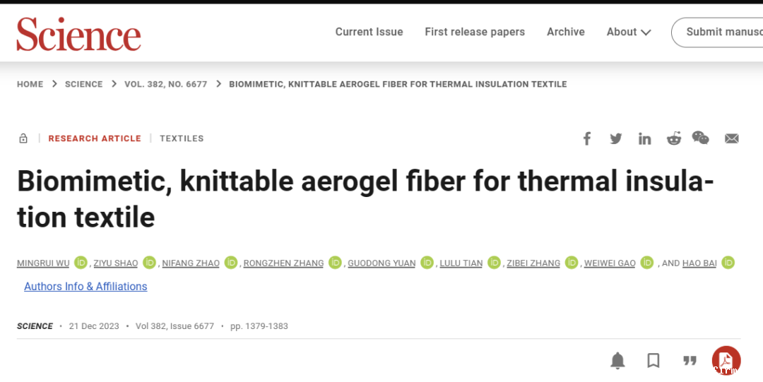 基于此,浙江大学一团队模仿北极熊毛发的核壳结构,在气凝胶纤维中封装了一层可拉伸层,从而克服了这些问题。研发的气凝胶纤维内部孔隙率高达90%以上,拉伸应变显著提高到1000%,这相较于传统气凝胶纤维的2%应变有了很大的改进。该气凝胶纤维不仅耐洗、耐染,而且具备强大的机械强度,在经历1万次拉伸循环(100%应变)后,依然能够保持稳定的隔热性能。用这种纤维编织的毛衣,厚度仅为羽绒服的五分之一,但性能却与其相当。研究团队采取的多功能气凝胶纤维策略为发展纺织品提供了广泛的可能性。相关成果以“Biomimetic, knittable aerogel fiber for thermal insulation textile”为题发表在《Science》上。