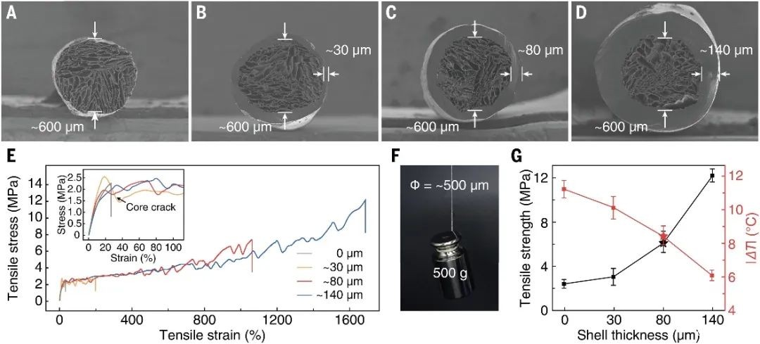 在机械性能方面,加入致密封装层后,气凝胶纤维变得非常坚固且可拉伸。随着封装层厚度的增加,纤维的拉伸强度从 2.3 MPa增加到 12.7 MPa,而伸长率则从 24% 增加到 1600%。虽然EAF 核心结构在拉伸过程中可能会断裂,但封装层仍保持连续,这确保了 EAF 结构的完整性和功能的稳定性。