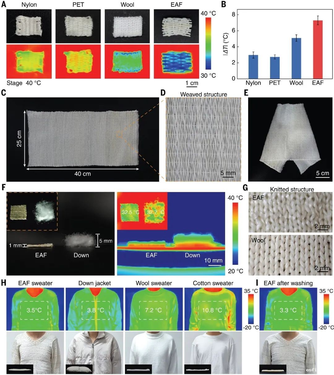 基于 EAFs 极佳的柔韧性和强度,进一步将其编织成气凝胶纺织品。研究团队将 EAF 与尼龙、聚酯和羊毛纺织品放于同一热台上进行比较。结果证实 EAF 纺织品的隔热性能更为出色。此外,研究团队还使用工业用剑杆织机将 EAF 织成了 40cm × 25 cm的织物。这反映出EAF 具有生产可扩展隔热纺织品的潜力。下图中隔热纺织品的放大图表明EAF 可以抵抗编织过程中的剪切和拉伸。由此产生的织物还具有足够的柔韧性,可以折叠或弯曲成各种形状,这对于舒适的穿着也至关重要。此外,由于具有封装层,纺织品也可水洗的。用商用洗衣机洗涤后,没有观察到外观有任何明显变化。