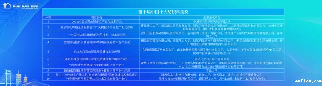 会上,第十届“中国十大纺织科技奖”获奖名单正式发布。通用技术新材中纺院Lyocell长丝高效制备及产业化技术开发,数字驱动织造全流程智能工厂关键技术开发及产业化应用,一次成型纺织双面数码印花技术、装备及应用,热湿舒适性复合功能纤维材料制备关键技术及产业化,家纺床品高效短流程关键技术及应用,高色牢度深色纯棉节水染色关键技术应用与产业化,气纺纳米纤维规模化制备成套技术及产业化,高耐碱高耐氧漂分散染料制备关键技术及产业化应用,基于十万吨级生产线无机/有机复合阻燃纤维素纤维技术集成研究,特宽幅丝绸平幅染整工艺技术及成套装备产业化等项目荣获“中国十大纺织科技奖”。其中,Lyocell长丝高效制备及产业化技术开发斩获“中国十大纺织科技奖”金奖。