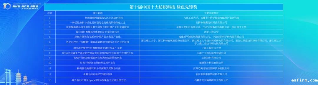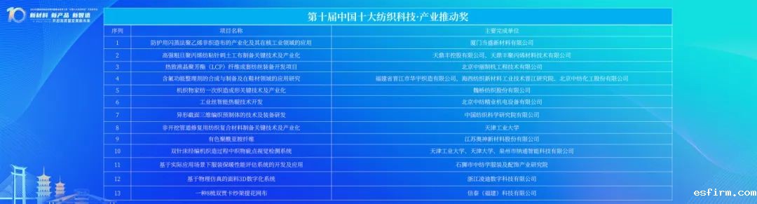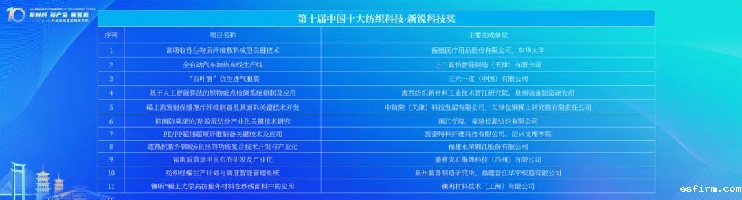 高吸收性生物质纤维敷料成型关键技术等11个项目获得“中国十大纺织科技·新锐科技奖”;防护用闪蒸法聚乙烯非织造布的产业化及其在核工业领域的应用等13个项目获得“中国十大纺织科技·产业推动奖”;纺织面辅料超临界CO2无水染色技术等13个项目获得“中国十大纺织科技·绿色先锋奖”。