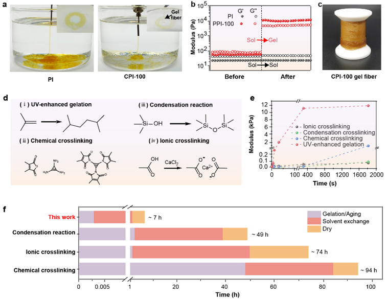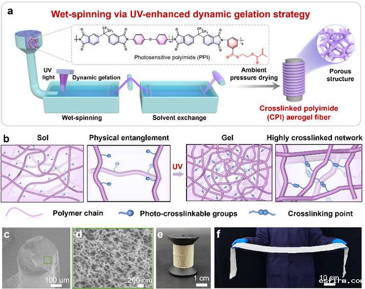 研究人员合成了一种侧链上含有不饱和双键的有机可溶性光敏聚酰亚胺纺丝液,其通过喷丝头挤出后,在紫外增强动态凝胶策略下,随机分布的分子链在紫外线照射下快速交联形成高强度的凝胶网络,通过溶剂置换和常压干燥制备了CPI气凝胶纤维。其快速凝胶化过程和常压干燥为快速、连续和大规模地制备CPI气凝胶纤维提供了可能性。