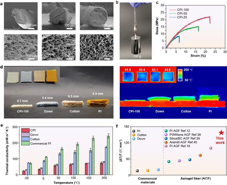 研究人员进一步探究了交联度对CPI气凝胶纤维性能的影响,发现随着交联度增加,CPI气凝胶纤维的收缩率逐渐降低,其形态由不规则的腰果状转变为规则的圆形。这主要归因于CPI-100的高度交联网络,避免了常压干燥时结构坍塌。将编织的CPI-100气凝胶织物与羽绒、棉和聚酰亚胺织物放置于热台上进行隔热性能对比。研究发现,CPI气凝胶织物的隔热性能几乎与羽绒相同,而厚度仅为羽绒服的1/8,表现出超薄、隔热的特性。