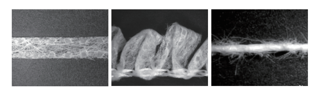 得益于柔软而蓬松的手感和丰富的毛形感,非织造布分切加捻纱线可以用于生产编织制品、地毯、鞋、包、服装面料等。日本旭化成公司对非织造布分切成纱技术进行了探索,推出一款非织造布切丝产品系列“丝瑞丽”(SLARIT),相关产品是将尼龙、聚酯、聚丙烯非织造布等切割成 3、5、10 mm条带,可用于生产扁平纱、花式纱、加捻纱等。