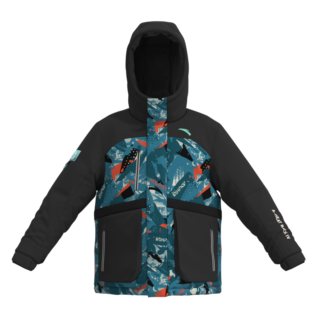 “热返四代”儿童羽绒服灵感来源于长白山地区,图案上使用意象化处理过后的长白山景象。采用了安踏儿童最新的热返IV代技术,将德国热返技术与3D结构完美结合,减少了热量的流失,提升了保温效果,同时热返层还具备透气性,让服装内部具有微气候循环,提升了舒适性。服装外体面料采用生物基防泼水剂处理,减少了水、能源消耗和环境污染。外观上运用全新的立体结构,花型采用凹面镜设计,利用光的反射发生聚焦,来提升热返升温效果,同时立体结构存储更多空气,进一步提升了材料的隔热保暖性。