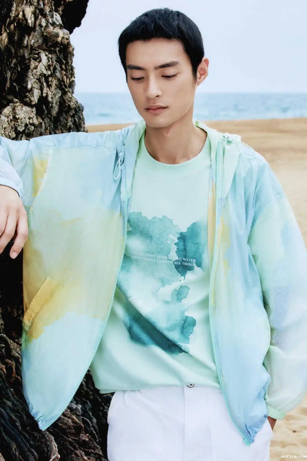 “蜉蝣美术馆2.0”海洋环保系列休闲夏装选用UNIFIREPREVE® OurOcean™再生纤维为核心原料,与新疆棉混纺海洋回收环保纤维,打造手感和品质兼具的新型环保再生面料,其环保纱线是由100%回收原料,包括消费后的塑料瓶制成,是将其碎片化、颗粒化,经过纺丝、加弹工艺生产制成的高品质、高性能的再生纤维。产品将木糖醇凉感整理剂通过常规浸轧或涂层等方式附加到面料上,使其具有瞬间凉感功能。设计上,用海水晕染与日出渐变图案体现海洋的静谧与变幻,图案整体搭配治愈的低饱和色彩,将可持续理念设计入衣,倡导大家关注海洋生态。