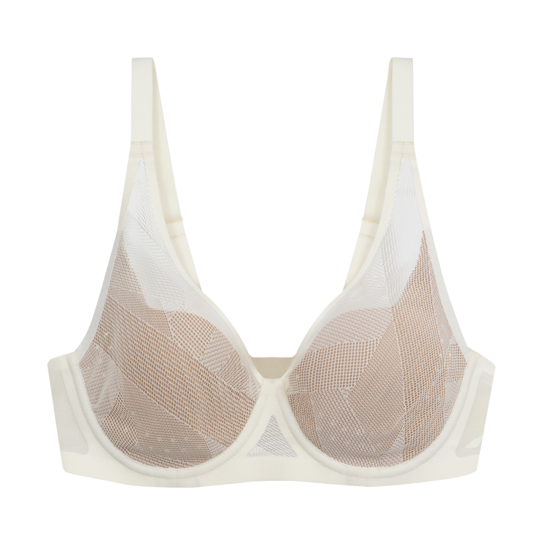 人体美学内衣采用锦纶和氨纶制成的超轻薄大孔洞随意裁面料,搭配亲肤网眼,始终保持透气透湿,清爽舒适。依据人体曲线,设计W碗围软支撑结构,稳定承托乳房,侧翼处通过胶骨贴片,调整乳侧赘肉,达到视觉人体之美。原创花型采用激光镭射+定位冲切技术组合,贴肤净痕无缝线,全方位提升亲肤舒适度。产品将防凸点布杯工艺以及洞洞杯两项技术相结合,打造出新一代透气性更好的防凸点花瓣布杯。