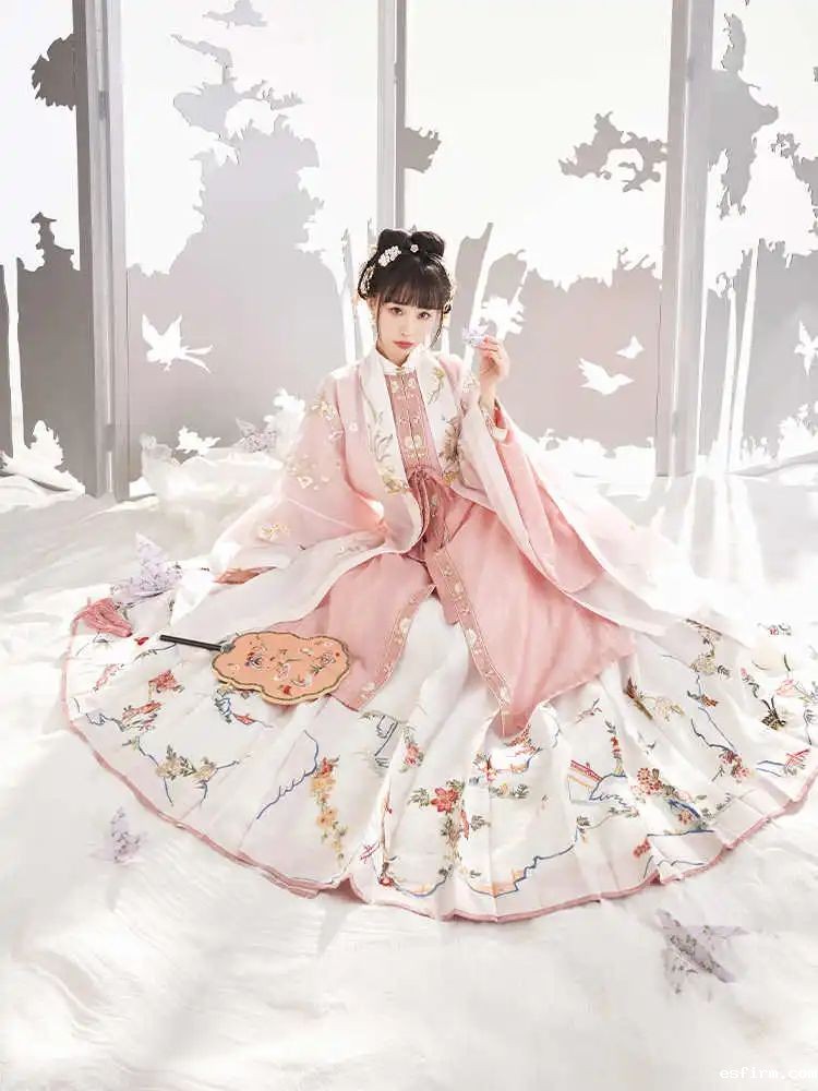 “美哉”明制汉服以“白色暗花纱绣花鸟纹裙”为灵感,提取山东博物馆馆藏中的花鸟纹裙裙身纹饰,将春景定格在马面裙上。产品由披风、立领对襟长衫和马面裙组成,披风和立领对襟衫在形制上与马面裙对应,立领、对襟衫、门襟运用三种不同刺绣针法,通过对绣花机器进行改造,使花型更加饱满逼真。大身选用亚麻/真丝/棉面料,给予马面裙良好的亲肤性和透气性,亚麻的加入使裙身微带筋骨,能够较好地保持马面裙的形制效果。产品设计上,延续花鸟裙原本氛围基础,改变原有绣花针法,使生物形态更加灵动,山水细节更加精致;特殊针法和金属丝线的加入,打造了华丽贵气的视觉效果。