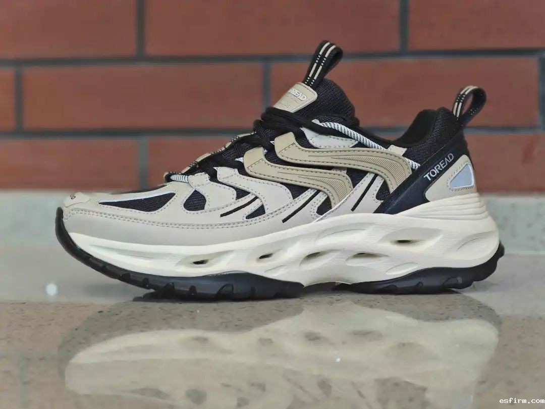 “775二代”多功能休闲溯溪鞋的橡胶鞋底采用雨蛙特有的吸盘脚趾仿生设计,提取并使用在鞋底花纹设计上,增强在湿滑的路面、水流、潮湿的岩石等多种环境的抓地力,达到防滑效果;中底内部有横向凹槽,凹槽的两端与中底侧孔洞贯穿。当水进入鞋内时,积水就会通过横向凹槽再从侧孔洞迅速排出,达到鞋内无积水现象,提升鞋子的速干性能。鞋面运用提花机台技术制造,利用组织排列及数位提花生产工艺技术,勾勒出高强结实的组织结构纹理,鞋面采用防泼水处理,可延缓鞋面短时内被雨水渗透,有效抵挡瞬间泼水。