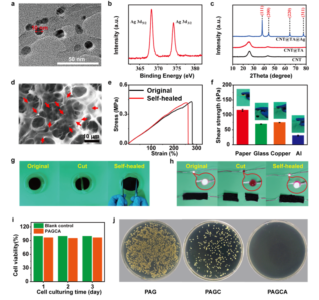 北京化工大学杨丹教授团队通过原位聚合,将镀银碳纳米管(CNT@TA@Ag)均匀分散在明胶和聚丙烯酰胺(PAM)双网络体系中,制备出一种自愈合、抗冻、抗菌纳米复合水凝胶(PAGCA),并将其构建成基于压阻效应的冰壶运动员姿势检测和基于摩擦电效应的冰壶石违规检测系统,从而可以有效提高运动员的训练效率和裁判判罚的公平性(图1)。PAM、明胶和CNT@TA@Ag杂化填料中丰富的氢键相互作用赋予PAGCA优异的自愈合性能,其自愈合效率高达92%以上。采用甘油置换水凝胶中的部分水,可以有效防止冰晶形成,从而赋予PAGCA抗冻特性,其在零下30度仍保持良好稳定性能。CNT@TA@Ag杂化填料表面上的银纳米粒子可以释放出银离子(Ag+),从而抑制DNA复制,影响细菌细胞的活力,使得PAGCA杀菌效率达到100%(图2)。基于PAGCA的应变传感器具有较高的灵敏度和快速响应时间,可以精确监测冰壶运动员的各种关节弯曲运动,从而有效提高运动员日常训练效率(图3)。此外,将PAGCA包埋入PDMS中,组装成的单电极TENG在零下30度可以正常工作,并保持良好稳定性能(图4)。集成多个TENG传感器,可以实时检测冰壶石的有效性、发球违例及刷冰状态分析(图5)。此外,TENG传感器还可以判断冰壶石的具体位置并进行碰撞分析(图6)。总之,基于PAGCA的自供电和自修复违规检测系统,不仅为冰壶比赛中的违规检测提供了一种智能方法,而且还展示了其在其它体育赛事中快速、公平的判罚以及运动员智能和数字化训练中的应用前景。