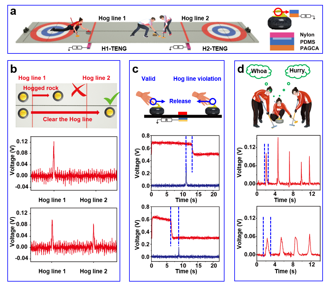 图5. PAGCA基摩擦电传感器用于判断冰壶石是否有效、检测发球违规以及刷冰状态分析
