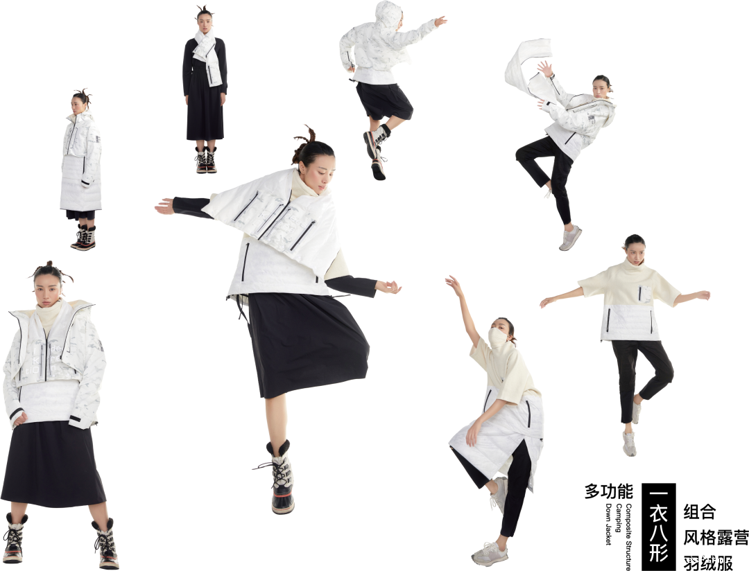 “一衣八穿”复合结构露营羽绒服最大的设计创新为“一衣八穿”,使用一套服装上的部件,通过高效易用的拆卸组合方式,达成八种不同的穿搭形式,满足在城市及户外等多场景下的功能和使用需求。产品包括中层、外层和下摆,“复合款式结构”是指由多部件组合形成的服装结构设计,可变化的产品造型保持审美新鲜度,可组合的功能部件适应多种场景使用。产品领口、袖口及内部采用激光镭射延展结构,在运动状态下使服装内部与外部的温度和湿度有效交换,达到“舒适保暖”的穿着体验。