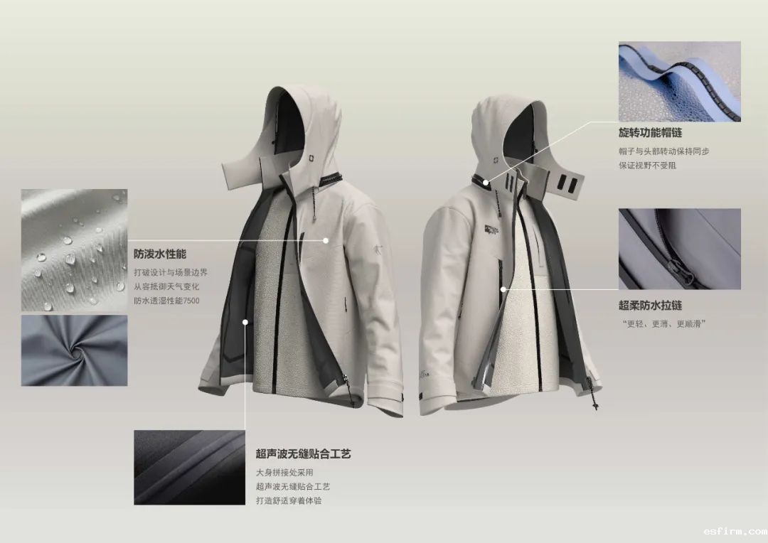 “乔峰”三合一冲锋衣主色采用云雾灰颜色,理念来自“清晨时还未散去的将世界变得朦胧的晨雾”,是一种显高级又很好搭配的灰色系。产品在功能设计上采用多功能面料三合一结构,外部是防水透湿面料,使用无氟防水剂,对环境无污染;里料是保暖摇粒绒,采用特殊工艺生产,使手感更蓬松,更柔软;外套使用亲肤轻柔贴膜工艺、防水拉链以及拼接大小不一的口袋,满足户外的不同需求及美观度。产品采用旋转帽链设计,当人体头部向左或向右转动时,下布带上侧的链牙随之在管芯状链带内滑动的摩擦阻力,从而实现衣服帽子的转动自如。