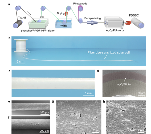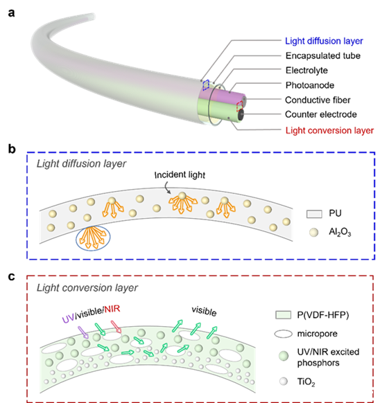 研究人员在传统纤维染料敏化太阳能电池结构的基础上,进一步在最外层封装管上构建了基于氧化铝/聚氨酯薄膜的光扩散层,在内部对电极上构建了基于荧光粉/二氧化钛/聚偏氟乙烯-共六氟丙烯薄膜的光转换层。