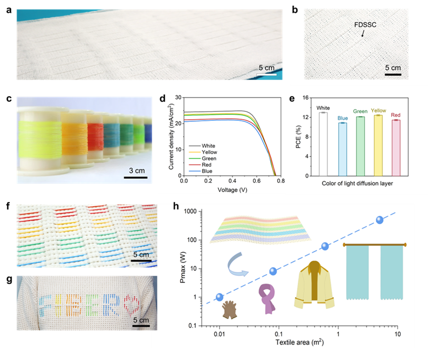 所得高性能FDSSCs显示出均匀的颜色和外观,与织物具有很高的兼容性。在光扩散层中引入少量颜料,可以实现FDSSC外观颜色的调控。由于Al2O3/PU薄膜具有较强的光扩散能力,少量颜料即可使FDSSC显示出明显的视觉颜色。此外,尽管颜料在可见光波长范围对透过率有一定影响,但光转换层能有效利用近红外波长的入射光,因此彩色的FDSSC依旧保持较高的光伏性能,例如在黄色和绿色外观下,PCE分别高达12.45%和12.13%。多彩FDSSC可以通过编织工艺得到各种尺寸和类型的织物,以满足不同的供电需求。