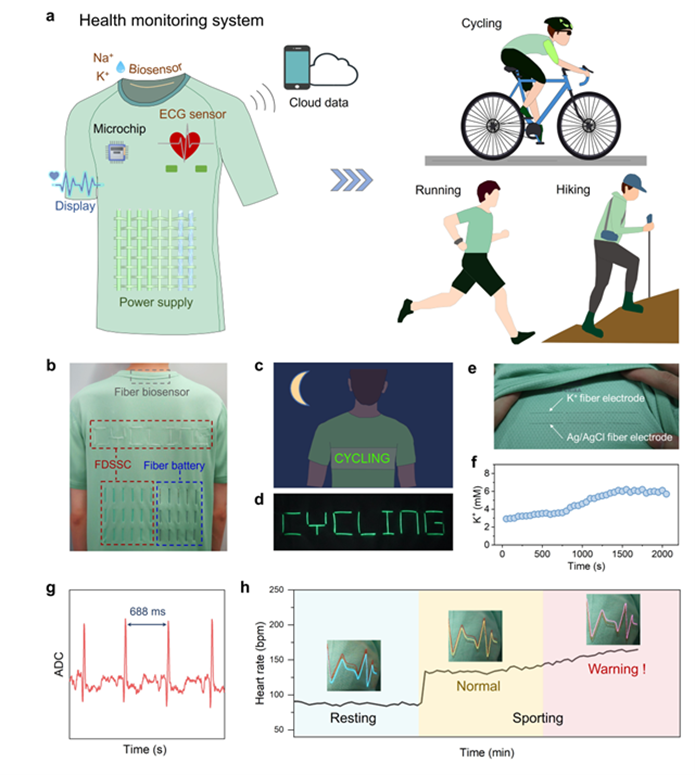将FDSSC与纤维电池编织集成,构建供能织物,除了能直接对可穿戴电子设备供电,还可以进一步与传感器、显示器、微芯片等其他功能元件集成,构建复杂的功能系统,推动智能电子织物的发展。