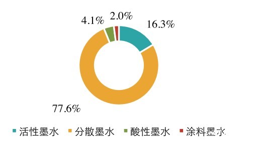 根据中国纺织机械协会数据,2021年我国分散墨水消耗量约占总墨水消耗量的77.6%。分散墨水主要用于化纤织物印花,其中大部分为低温热转印,其数码印花工艺简单,无污水排放。小部分为直喷印花,使用高温型分散墨水。活性墨水主要用于棉、毛、丝、麻和再生纤维素纤维织物印花,印花工艺比较成熟,未来的发展方向是进一步提高印花速度,主要通过更多高速工业喷头的装配实现。酸性墨水主要应用于羊毛和锦纶等织物印花。随着全民运动热潮的兴起,瑜伽服、泳装、皮肤衣的市场规模不断增加,对于锦纶印花面料的需求也相应增加,酸性墨水市场份额也在逐年增长。