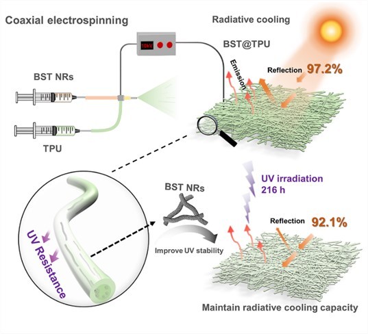 近日,哈尔滨工业大学的李垚教授、潘磊研究员等人提出了一种新型辐射制冷薄膜材料——BST@TPU膜,通过同轴静电纺丝将钛酸锶钡纳米棒(BST)和热塑性聚氨酯(TPU)结合在一起。BST纳米棒能够强效吸收紫外线,有效分散在TPU表面的紫外线辐射,避免了紫外线积累导致的持续损伤;同时,BST纳米棒的高折射率增加了可见光的散射,补偿了紫外线吸收所引起的反射率下降。因此,BST@TPU膜的整体反射率达到了97.2%,发射率为93.2%,净制冷功率为125.21W·m−1。DFT计算进一步证明了BST纳米棒能够捕获TPU在紫外线老化过程中产生的自由基,从而有效防止了TPU的黄变反应。即使在经历了相当于144天户外暴露的加速紫外线老化测试,BST@TPU膜的反射率依然保持92.1%,将其户外使用寿命延长至TPU膜的 3 倍。该研究成果以“A Novel BST@TPU Membrane with Superior UV Durability for Highly Efficient Daytime Radiative Cooling”为题发表在《Advanced Functional Materials》上。