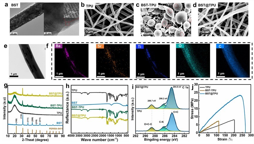 同轴静电纺丝技术具有独立控制芯层和壳层的流变性能的特点,这使得BST纳米棒在纤维中的分散更加均匀,有助于增强光学和机械性能。通过SEM、TEM、XRD以及FT-IR等基础表征技术,成功证明了BST@TPU膜的制备。此外,BST纳米棒能够有效地将应力从柔软的TPU转移到刚性的BST纳米棒上,进而提高了膜的整体拉伸强度。与TPU膜相比,BST@TPU膜的杨氏模量从3.96MPa提高到了9.87MPa。这种增强主要归因于BST纳米棒沿着纤维轴的均匀排列,有助于有效地传递张力,从而提高了BST@TPU膜的韧性和耐久性。