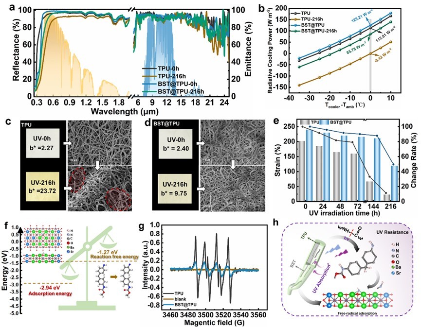 薄膜的反射率曲线的变化证实了BST纳米棒在增强TPU紫外线耐久性中的关键作用。经过216h的强紫外线照射,BST@TPU膜的反射率保持在了92.1%,而TPU膜的反射率下降到84.2%。反射率的下降明显影响了薄膜的日间辐射制冷能力。在216小时的强紫外线老化辐照后,TPU膜的最大理论冷却功率为−0.42 W·m−2,基本丧失了制冷性能。而BST@TPU膜在相同的老化条件下保持了85.78 W·m−2的理论辐射冷却功率。此外,BST@TPU膜表现出了更优异的机械性能。BST纳米棒的加入有效地捕获了NH·自由基,阻断了TPU的自发老化反应并防止其发黄。此外,BST纳米棒还可以捕获TPU中由于紫外线诱导而产生的自由基,从而抑制自由基的传递,延缓TPU的老化过程。