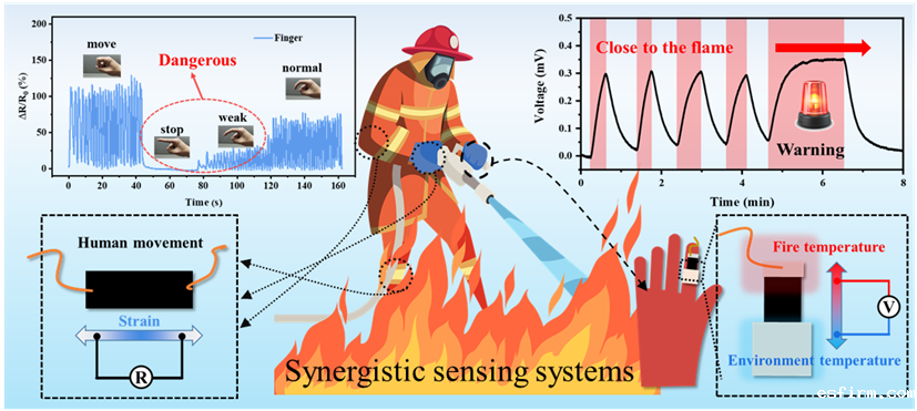 近日,江南大学王强教授课题组制备了一种柔韧、反应灵敏、高拉伸性和高透气性的聚(3,4-乙撑二氧噻吩)/多壁碳纳米管(PEDOT/MWCNT)热电织物,可用于消防服绝缘层破损(温度)和消防员移动异常(应变)的双参数协同感应。