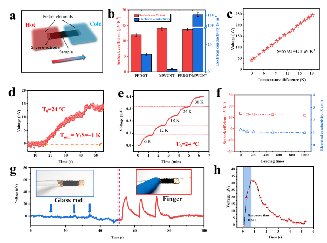 研究人员基于PEDOT和MWCNT出色的塞贝克效应,将PEDOT/MWCNT@PLF组装成自供电温度传感器,并在室温下进行了温度灵敏度测试。结果表明,即使经过1000次弯曲,该热电织物的电导率和塞贝克系数也仅有轻微下降,具有良好的可重复性和稳定性。基于灵敏、稳定的温度识别和连续自供电性能,当玻璃棒和手指接触该温度传感器时,分别出现了微弱的负信号和较强的正信号,温度传感器的响应时间仅为0.60 s。