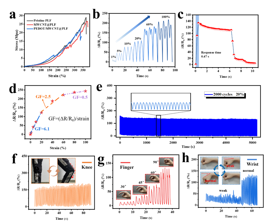 PEDOT/MWCNT@PLF应变传感器的应变传感性能和人体运动监测