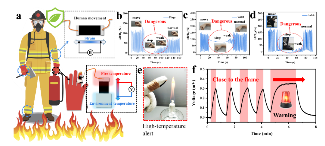 PEDOT/MWCNT@PLF具有灵敏的温度识别能力、良好的机械性能和拉伸性,因此被开发成一种自供电双参数传感器,具有健康异常和温度阈值警报功能。双模式传感器被集成到手腕、手指、膝盖和脚踝等身体关节处,以实时检测使用者的运动;集成到舒适层和隔热层之间,可以监测消防服的破损情况。一旦消防员在事故现场被困或受伤,或消防服隔热层的温度达到临界值,双参数传感将实时提醒消防员健康异常,并提醒基地工作人员及时实施救援,保护消防员的人身安全。