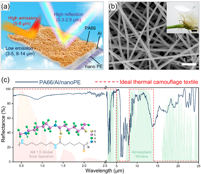 国防科技大学刘东青、程海峰团队针对该问题发表了题目为“A personal thermal camouflage material based on nanofibrous polyamide membrane”的文章,研究基于PA66的本征红外吸收特性和金属Al的高反射特征,采用磁控溅射和静电纺丝两步法制备了一种金属–聚合物复合多层膜PA66/Al/nanoPE。在静电纺丝制备外层PA66纳米纤维膜的过程中,纤维随机堆叠形成多种纳米、微米级无规则孔状结构,当散射体(纤维和孔)的尺寸接近或远小于入射电磁波长时,会发生米氏和瑞利共振散射,从而反射太阳光并呈现白色外观。鉴于PA66纤维膜中散射体尺寸多分布在百纳米级别,可对短波太阳光产生强烈的Mie散射,提供了兼容紫外伪装的可能性。另外,交错的孔隙结构可为水蒸汽的通过提供通道,赋予该结构透湿性。金属反射层可弥补PA66纳米纤维膜在近红外波段反射率的不足。结合FDTD仿真,进一步验证了实验结果的合理性。
