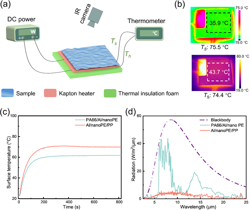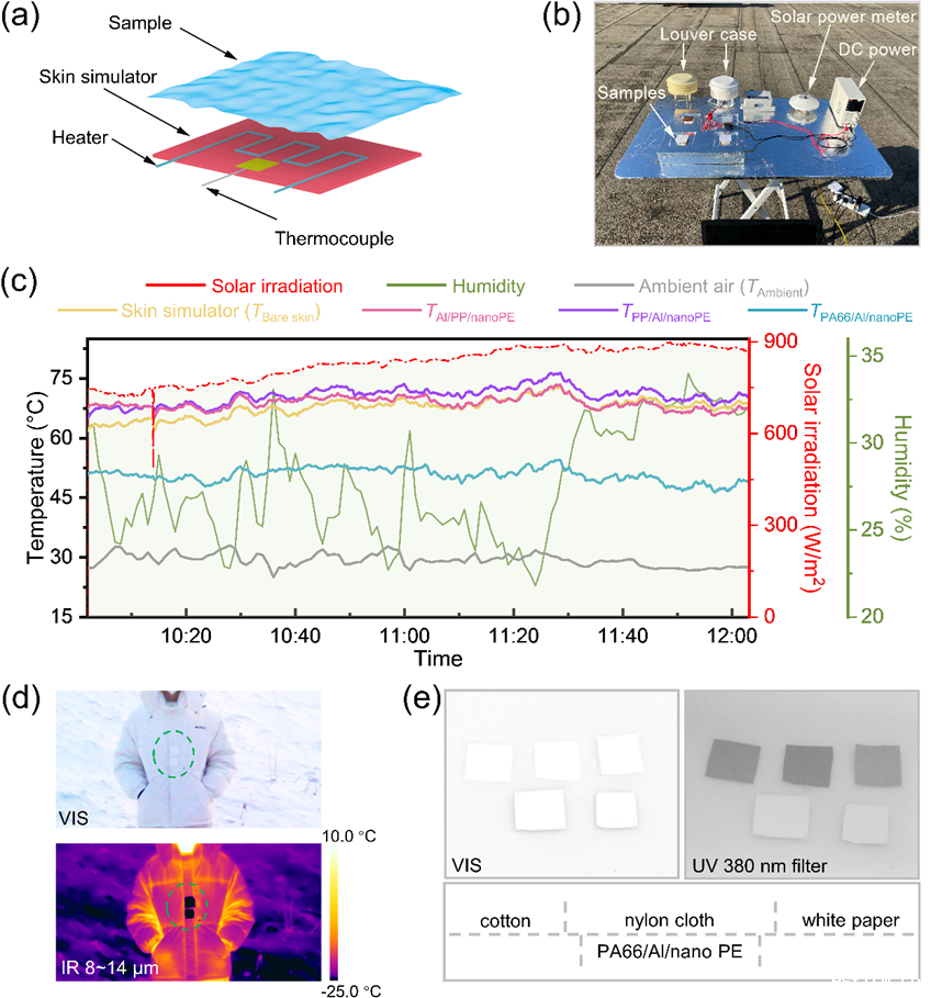 PA66/Al/nanoPE复合多层膜实现了3~5μm和8 ~14 μm探测波段低发射率,以解决热伪装需求,同时实现了5~8 μm非探测波段高发射率,以实现红外选择性辐射散热降温。相同加热条件下,与无选择性辐射样品对比具有更低的平衡温度。静电纺丝PA66纤维膜的纳米孔、纤维结构带来的米氏散射效应与底部金属反射层协同作用,实现了>90%平均太阳反射率,在峰值太阳辐射强度下,与太阳反射率欠佳的低发射率伪装薄膜对比,可实现约20 °C的降温效果。此外,该多层膜在300~400 nm的紫外波段具备高反射能力,满足紫外伪装要求,可实现兼容雪地背景的热伪装,透湿防风,可作为冬季雪地背景下的个人热伪装服用材料。
