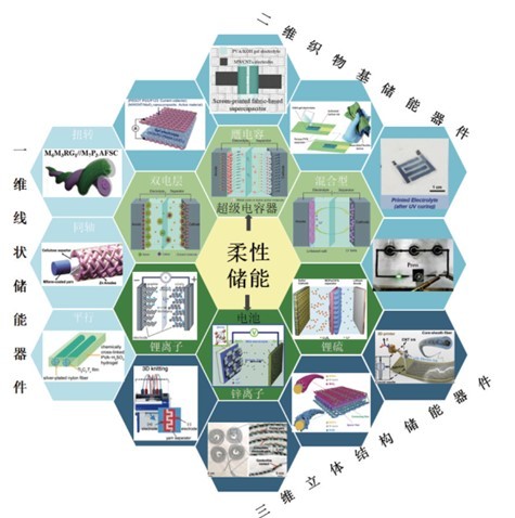 能够连续稳定地工作是智能纺织系统的基本要求,而其电源问题是一个较大的挑战。为解决电子纺织设备的电源问题,现如今解决方案主要是以发展储能和能量收集纺织器件为主。纺织基柔性储能器件的主要类型如图1所示。