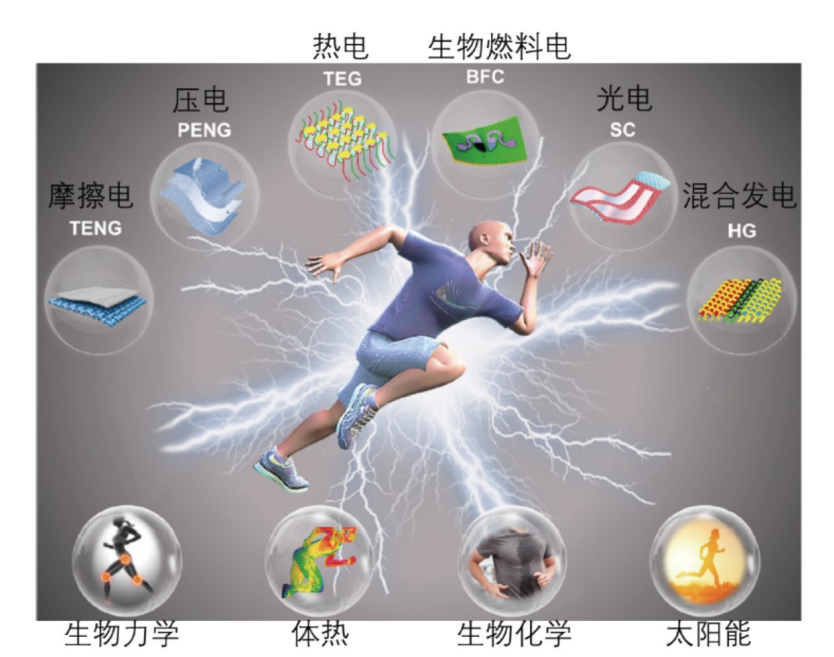 能量收集技术是一项绿色、可持续的技术,其通过将环境能量(太阳能、风能、热能、机械能、电磁能等)转化为电能,为物联网时代的可穿戴电子产品提供无处不在、环保、可持续的能源解决方案。人体及其周围环境存在多种可转化为电能的能量,包括生物力学运动能、体热、生物流体化学能和太阳能等(图2),通过将纺织品与发电融合,实现依靠人体及其周围环境进行发电。