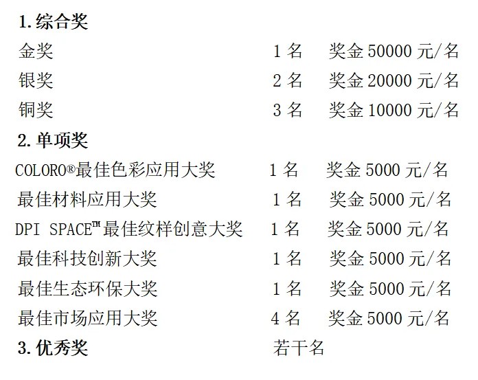 赛事设立“综合奖” “单项奖”和“优秀奖”。其中最佳色彩应用大奖由中国应用色彩体系 COLORO®冠名,最佳纹样创意大奖由人工智能图案创意设计平台 DPI SPACETM冠名。