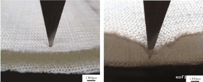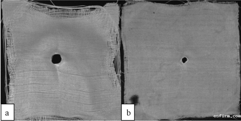 将高性能纤维制成的机织物、针织物或非织造布,通过相同或不同织造结构的织物多层复合铺叠可制成纯织物结构防刺材料。孔祥勇研究了超高分子量聚乙烯经编间隔织物的防刺性能,结果表明单一间隔织物达不到动态穿刺测试要求,增加间隔织物的密度与厚度可以改善织物的防刺性能。由于柔性织物内部布满孔隙,使得尖锐物能够轻易透过孔隙刺入材料,为了具备标准要求的防刺性能,纯纺织结构的防刺材料通常需叠加几十层的织物,导致材料的厚度大大增加,材料柔性降低,克重无法达到合适的结果。