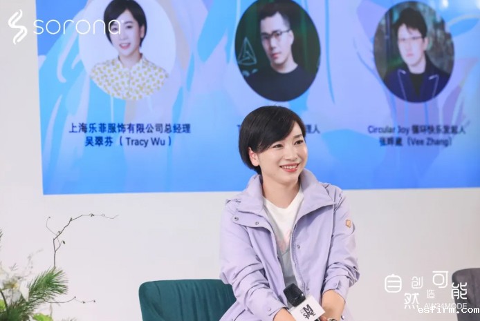 当SORONA®为面料端带来创意赋能的同时,品牌端的应用也为SORONA®生物基材料在终端市场增添了生命力和表现力。论坛上,作为SORONA®的合作品牌,上海乐菲服饰有限公司总经理吴翠芬,TRICKCOO品牌主理人黄俊勋,Circular Joy 循环快乐发起人张晔崴三位嘉宾受邀上台,在SORONA®大中华区市场经理李克洁的主持引导下,从各自的角度,阐述他们如何从SORONA®生物基材料获得创意灵感,又是如何以创新设计,赋予SORONA®以更多时尚与艺术内涵。