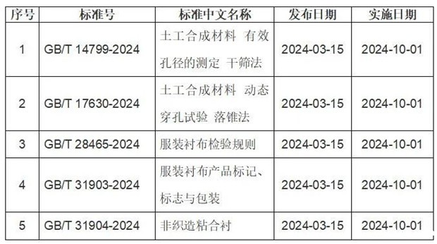 2024年3月15日,国家市场监管总局、国家标准委发布2024年第1号公告,批准406项国家标准。其中,产业用纺织品领域5项,标准自2024年10月1日起实施。