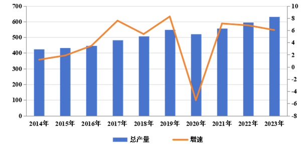 图3 2014~2023年中国化纤长丝织物产量(亿米)及增速(%)