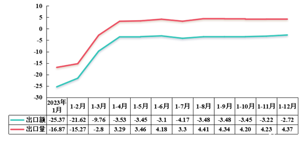 图5 2023年我国长丝织物累计出口金额、出口数量增速(%)
