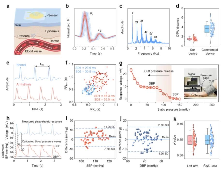 近日,西南交通大学邓维礼副教授和杨维清教授团队开发了一种层次结构的柔性压电复合材料实现了人体血流动力学的实时监测。该研究通过程控静电纺丝联合热压技术构建了多级层次化组装的MXene/BN/P(VDF-TrFE)柔性压电复合材料,克服了传统压电陶瓷材料硬脆的本征局限,实现了高压电性和柔性的兼得。基于MXene与聚合物基体间的界面极化和BN对体相漏电流的抑制,压电复合材料表现出高达41.67 pC/N的压电电荷系数以及342.9 mV/mN的压电电压常数,所研制器件压力响应灵敏度高达39.3 mV/kPa,这些优异的性能赋予了器件在可穿戴心血管监测领域的可行性。基于此,作者团队进一步研究了器件在血液动力学监测上的应用。结果表明,该器件可实现血压、局域脉冲波速、心搏出量等重要临床心血管指标的实时监测,且精度与商业化传感器件相当。此外,作者团队研究了柔性压电器件对血液动力学状态的全天监测数据,并结合机器学习算法实现了监测数据的分类判断,为患者的实时生理状态诊断提供了数据支撑。相关成果以“Hierarchical Piezoelectric Composites for Non-invasive Continuous Cardiovascular Monitoring”为题发表于《Advanced Materials》上。