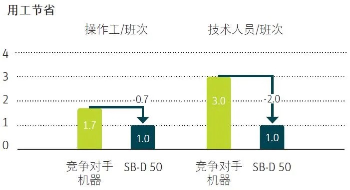 在与竞争对手解决方案的比较分析中,SB-D 50的投资带来了许多显著的收益。按10台机器计算,由于减少了用工和维护频次,此项每年可节省343,200元人民币。