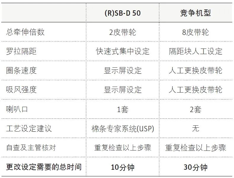 例如,对于3.5吨的差别化纺纱订单,(R)SB-D 50生产线可在24小时内完成,并与第二天的换批计划无缝衔接。这不仅使操作工每天的工作时间减少了1.4个小时,还意味着工厂年订单生产量增加了6%。