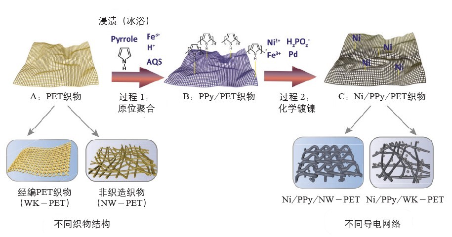 多层Ni/PPy/PET复合导电织物的制备工艺示意图