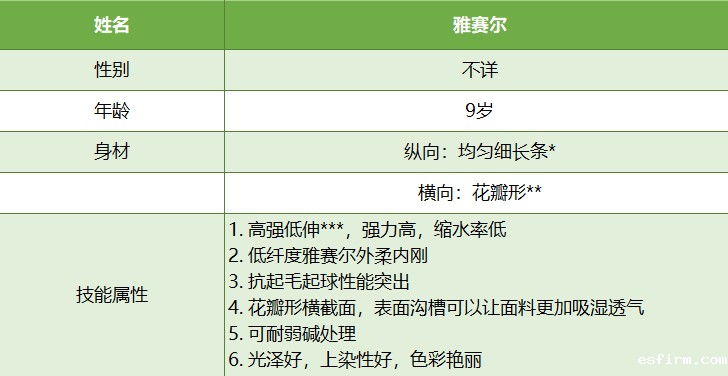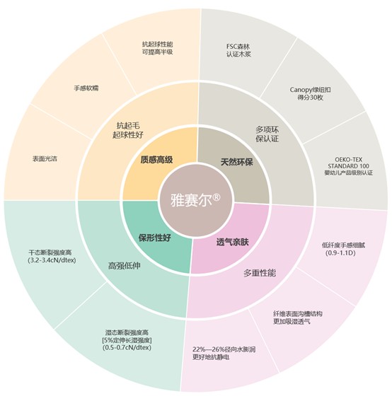 注:*指的是细度在0.9-1.1D,**指的是雅赛尔®横截面为柔和的锯齿形,***指的是雅赛尔®干态断裂强度3.2-3.4cn/dtex,湿态模量0.5-0.7 cn/dtex