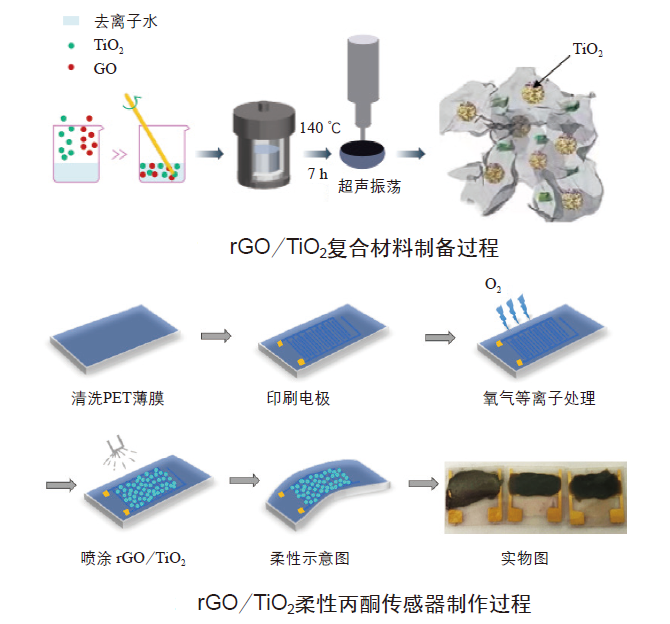 研究人员利用水热法使纳米TiO2颗粒生长于二维平面结构表面,制备了高表面体积比的三维rGO/TiO2复合材料,再通过喷涂法以叉指电极为基底制得rGO/TiO2传感器。