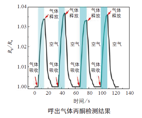 丙酮被认为是糖尿病的生物标志物,在正常人的呼吸气体中,其浓度处于(0.39 ~ 0.85)×10-6范围内,而糖尿病患者的呼吸丙酮浓度在(2 ~ 20 )×10-6,甚至更高。然而目前的柔性丙酮传感器很难实现在常温下的应用。因此,开发设计一种在室温下能快速响应且能提供宽工作范围的柔性丙酮传感器具有重要意义。