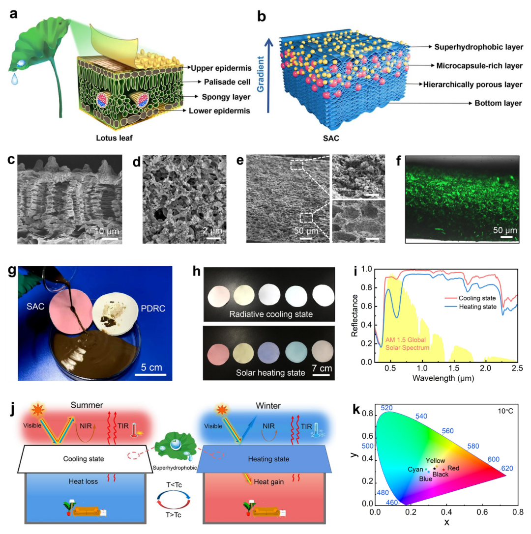 受荷叶的纵向梯度特征和表面微纳结构的启发,陕西科技大学薛朝华教授团队联合香港理工大学王钻开教授和华中科技大学陶光明教授团队合作研究,通过一步相分离工艺,制备出了一种集超疏水表面自清洁、太阳光反射率自动可调和热红外发射有效利用于一体的多功能调温涂层,实现了高温环境下的辐射降温和低温环境下的太阳能加热从而达到“冬暖夏凉”智能调温。
