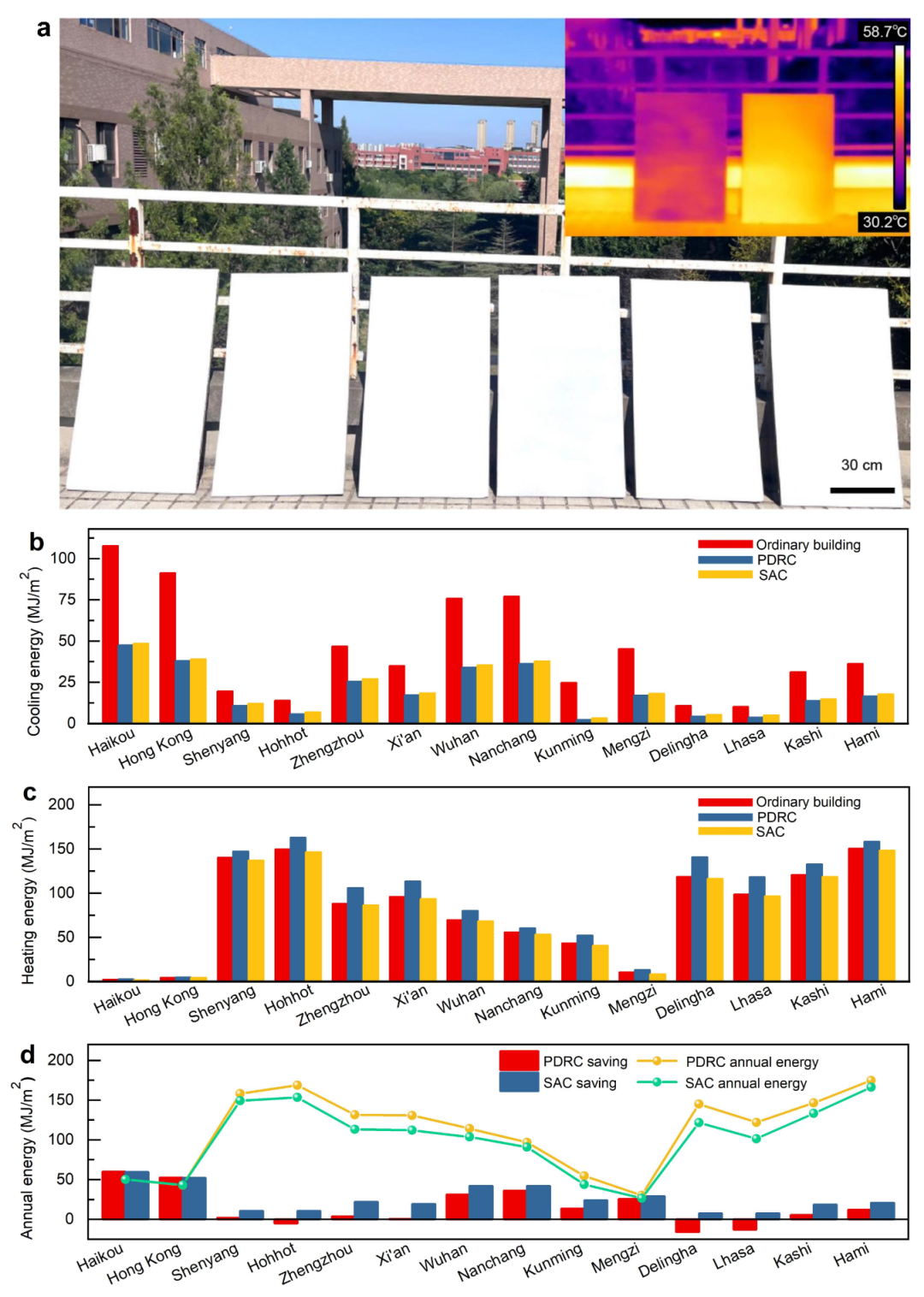 同时这种超疏水智能一体化涂层还可以作为一种热防护材料保护通讯设备和汽车等免受极高或极低的温度影响。能耗模拟结果显示,所设计的涂层与普通建筑相比制冷能耗平均节能53%,与传统的辐射降温材料相比年能耗最大节能18.7%。这项研究为智能调节辐射降温技术的大规模制造提供了新方法,有望推动辐射降温材料研究迈向户外实际应用,对于推动全球碳中和与可持续发展提供了一种全新的解决方案,以应对气候变化带来的挑战。