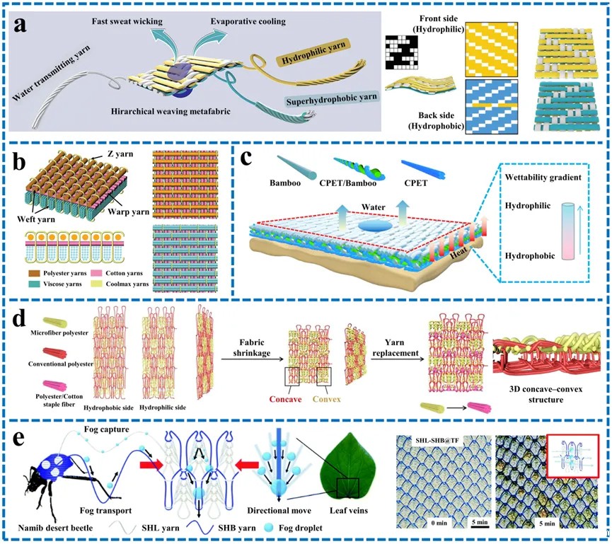液体传输,也称为定向液体传输(DLT),允许液体在材料系统中无能量控制地单向流动或渗透。这种现象在自然界和生物学中广泛存在,如仙人掌刺、猪笼草、蜘蛛丝等。基于这些自然现象的仿生技术已广泛应用于开发具有DLT特性的人工材料系统。这些具有DLT特性的材料在液体微流体控制、能量转换、界面催化等多功能应用中具有重要作用。现有的人工DLT材料主要利用润湿梯度和差异毛细效应进行多维设计。纺织品、海绵、高分子膜和无机材料(如金属网、硅基底、石墨烯膜)等常用于开发DLT材料。其中,纺织品因其相邻纱线或纤维间的可控间距,能够在孔道中实现多尺度梯度结构差异,且生产规模更大、成本更低。同时,纺织品的柔性材料替换特性和整理复合技术可以在厚度方向上实现梯度润湿性差异,从而在提高DLT性能方面具有显著优势。这种新兴的DLT技术与传统纺织材料的无缝结合,催生了下一代多功能纺织品,在可穿戴智能材料和生态环保等领域展现出重要的应用前景。