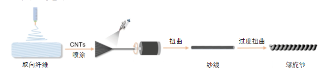 另一方面,研究人员等利用静电纺丝和喷涂的方式,制备了超高可伸缩导电螺旋纱。首先通过静电纺丝法制备PU纳米纤维,并将其收集在一个旋转的圆筒形接收器上。收集到的纳米纤维膜被切成条带状,随后将CNTs/乙醇悬浮液喷洒在条带上,喷涂后,将CNTs/PU纳米纤维复合条带扭曲成纱线,然后再进一步过度扭曲形成螺旋纱线。在软聚合物链、纳米纤维螺旋结构的协同作用下,CNTs/PU螺旋纱线打破了固有刚性对材料可弯曲性的限制,不仅表现出与直纱相似的高强度,而且表现出极高的拉伸能力,应变接近1900%,同时具有稳定的电导率和回复能力,在智能可穿戴纺织品、大应变传感器、软机器人等方面的竞争潜力巨大。