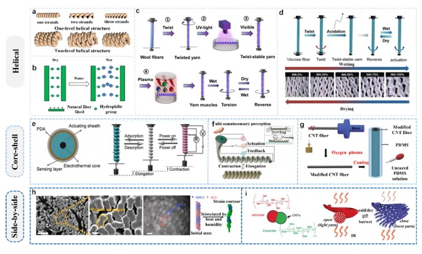 纤维/织物致动器的结构在一定程度上受到制备方法的影响,同时结构设计对制动器的性能也至关重要。这意味着具有不同层次结构的纤维/织物致动器在外部刺激下表现出不同的变形行为。如在外部刺激下具有收缩能力的纱线在加工成织物时可以实现弯曲变形。目前,纤维/织物制动器的结构类型主要有螺旋结构、并列结构、同轴结构、机织、针织、编织和非织造结构等。